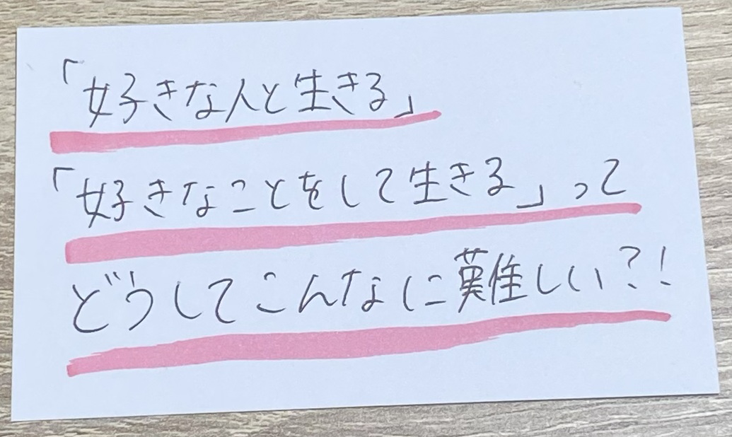 あと資本主義社会に疲れている自分にも気づきました。お金を持つことが幸せだと、社会に思わされているのではないか。本当は望んでいないものを手に入れられなくて、しんどくなっているのではと思ったり。