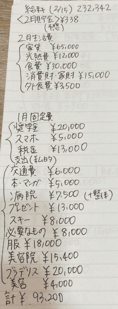 先ほどチラッと触れたとおり、私は2020~2024年まで派遣社員をしていました。派遣社員として就業中の、2023年2月の予算表を引っ張り出してきたので、金銭面から東京で暮らすことについて考えていきたいと思います。